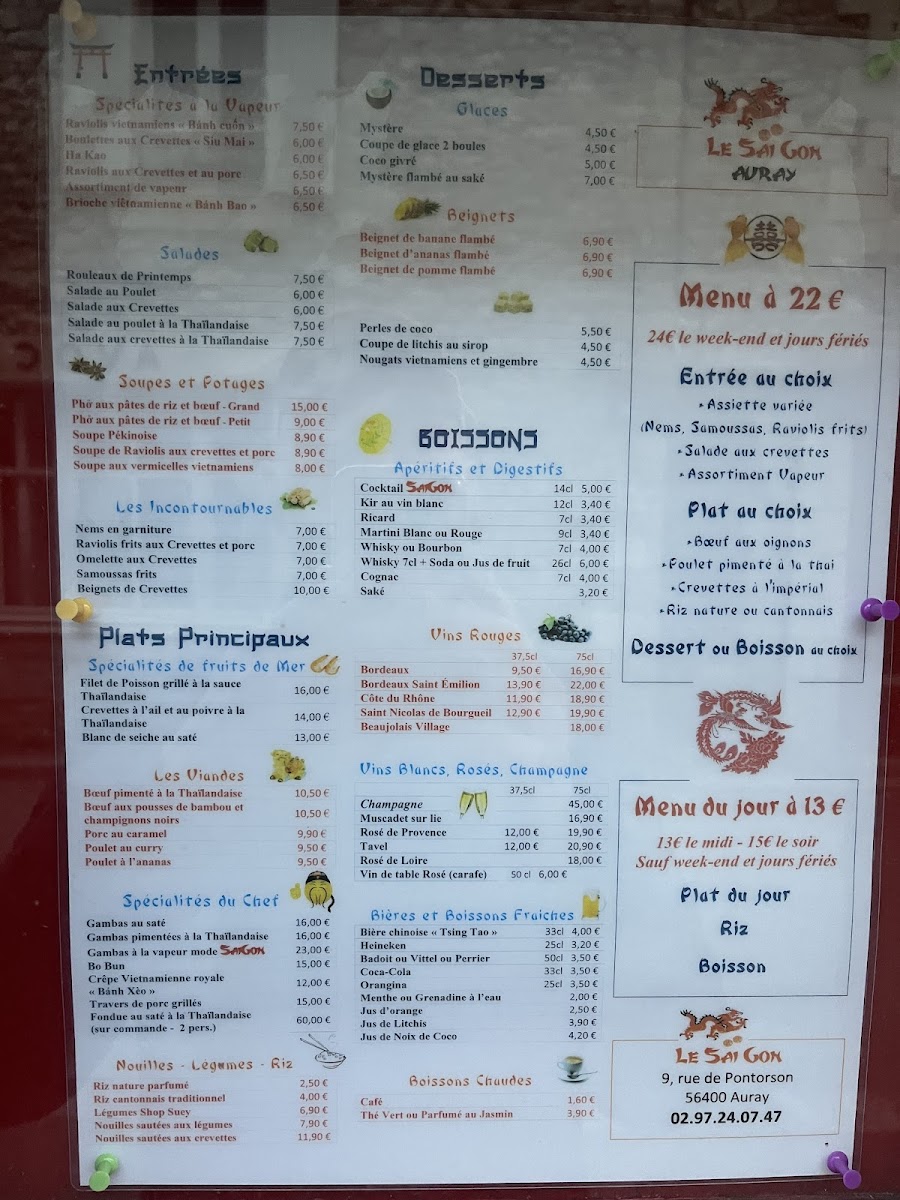 In conclusion, the menu at Le Saïgon offers a well-curated selection that captures the essence of Vietnamese cuisine while remaining approachable and satisfying. The appetizers stand out in particular, with Des Nems delivering a perfectly crisp texture and flavorful filling, while the Nem Samossas Raviolis provide a creative and delicious variation that blends familiar comfort with subtle exotic notes. Each dish reflects careful preparation and balanced seasoning, making the overall dining experience both cohesive and memorable. The pricing feels reasonable for the quality presented, and the variety ensures there is something appealing for both newcomers and seasoned fans of Vietnamese food. Altogether, the menu succeeds in offering a concise yet flavorful journey that leaves a lasting positive impression.